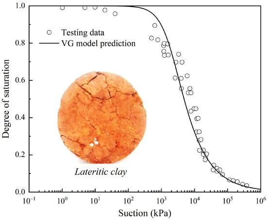 where , , , and are fitting parameters for lateritic clay, whose water retention behavior [45] is similar to the clay sample investigated in this paper (as shown in Figure 7).