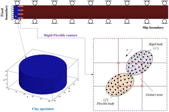 To simulate the loading condition in the SHPB test, the incident bar moves with a constant velocity to impact the soil specimen. By implementing the rigid–flexible contact algorithm proposed by Zhang et al. [46], the velocity of the rigid body can be automatically adjusted and the corresponding contact force can be updated, thereby achieving the nonlinear contact process. The initial velocity of the rigid boy was determined through trial calculation until the contact force matched the front force (or stress) of the specimen obtained in the SHPB test.