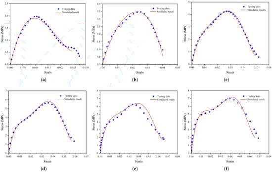 Comparison of testing and simulated stress–strain curves at different strain rates: (a) 204 s−1, (b) 362 s−1, (c) 438 s−1, (d) 497 s−1, (e) 541 s−1, and (f) 590 s−1.