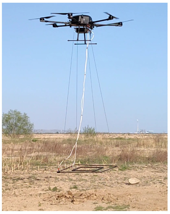 The suspended sensor assembly maintains a stable orientation relative to the ground during flight, enabling consistent magnetic data acquisition even as the UAV maneuvers along its flight path. The UAV follows a pre-programmed survey route with a line spacing of 0.5 m and a speed of 1 m/s, achieving high-resolution magnetic data collection across the survey grid.
