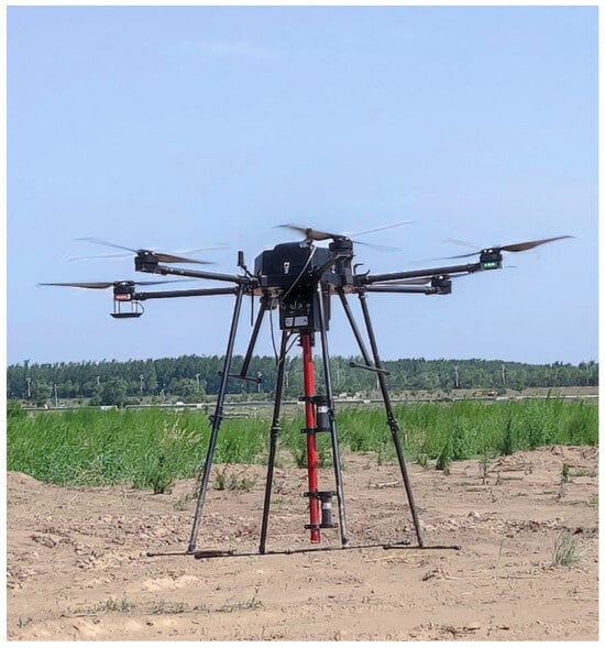 The UAV platform forms the foundation of the system, offering stability and precision in navigation, both of which are essential for achieving high-quality data in extensive survey missions. Following comprehensive performance evaluations, a six-rotor UAV from Sunward Technology Co., Ltd. (Zhuzhou, China) was selected, distinguished by its payload capacity, stability, and reliability under survey conditions. This UAV can support sustained flight with a considerable payload for up to 40 min, enabling efficient, large-scale surveys in a single mission.