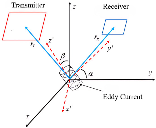 The time-domain electromagnetic (TEM) method is widely used to detect conductive anomalies in the subsurface. This method operates by generating primary magnetic fields that induce eddy currents within conductive targets, which in turn produce secondary magnetic fields that decay over time. Under far-field conditions—where the distance between the sensor and the target significantly exceeds the target’s dimensions—the secondary field response can be approximated by a 3D orthogonal magnetic dipole model, which simplifies the complex response of the target into three independent magnetic dipole components oriented along orthogonal axes, represented by the intrinsic magnetic dipole strength , , and [7,32].