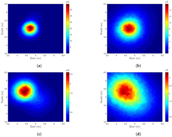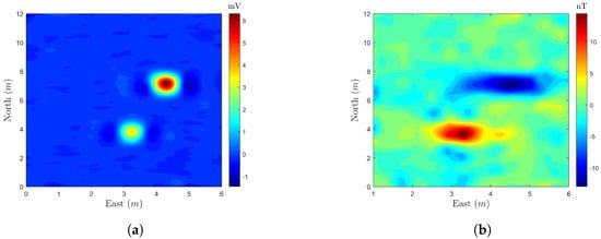 Figure 11 illustrates the electromagnetic and magnetic responses within the survey area, clearly highlighting the responses of the two targets. The vertical axis represents the northward position, meaning the top of the figure corresponds to the northernmost area in the survey. The horizontal axis represents the eastward position, ensuring a conventional north-up orientation as commonly used in maps. In the electromagnetic response, only the Z-component was collected, resulting in exclusively positive values. Due to the rapid attenuation of the electromagnetic response, the anomaly regions are relatively compact. In contrast, the magnetic response exhibits both positive and negative anomalies, attributed to the relative orientation between the targets and the geomagnetic field.