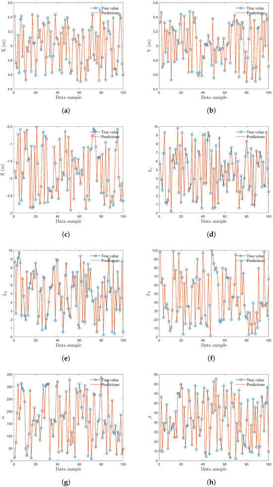 For spatial parameters, the model showed high consistency between the predicted and true values of the target’s position coordinates x, y, and z. The dipole moment exhibited slightly lower accuracy due to its larger magnitude, which introduces greater variability in predictions. Conversely, the parameters and , with lower magnitudes, were more susceptible to the influence of , resulting in minor deviations for a few samples. Overall, the deviations were minimal and did not significantly impact the prediction quality.