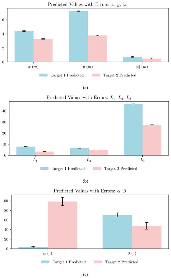 Given that our simulation region spans the range , we initially rescaled the area to ensure alignment with the defined simulation boundaries. Subsequently, two sets of data were input into MagEMNet for inversion, with the results presented in Table 4. Figure 12 shows the predicted values for two targets with corresponding error bars. The visualization highlights the differences between the predicted parameters for both targets, including spatial and angular metrics.