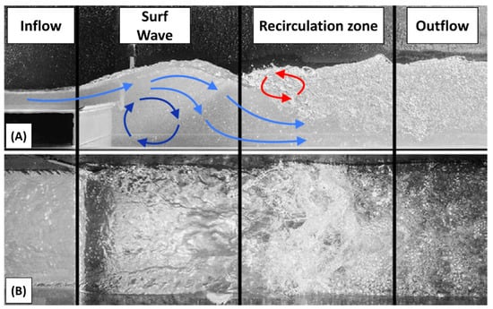 River surfing, characterized by standing waves remaining stationary over time, has grown in popularity since its inception in 1972 by the Pauli brothers in Munich, Germany. Initially, natural river features created these waves, but modifications to riverbeds and the development of artificial systems have allowed the sport to spread globally. Notable examples include the Eisbachwelle in Munich and waves in the Snake River in Wyoming, USA. The recent trend of creating artificial standing waves in existing rivers, e.g., as seen in Hanover and Nuremberg (Germany), aims to provide surfing opportunities without direct ocean access [1,2]. However, since building these artificial waves is still in its inception and each wave geometry is different, optimal inflow and outflow conditions have not been achieved yet. Laminar inflow conditions facilitate a glassy and desired wave surface. Outflow conditions behind the wave should exhibit a constant downstream flow carrying the surfer away from the wave. Recirculation areas (Figure 1) and back flow should be minimized or avoided since these may drag the surfer back into the wave, endangering them.