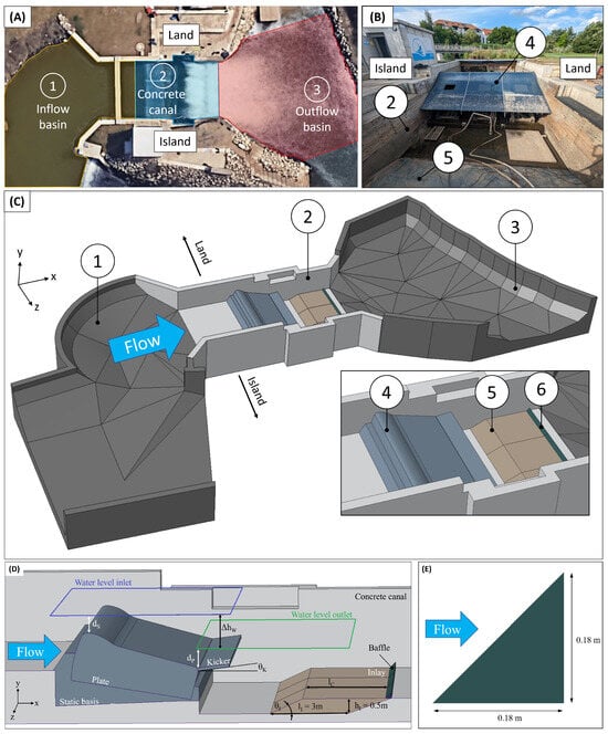 The Fuchslochwelle comprises various components, as depicted in Figure 2. These include the inflow basin, a concrete canal where the wave module is installed, inlays, a baffle, and the outlet basin. The basins represent the natural riverbeds, which were measured prior to the study to ensure accurate representation, especially of the outflow topology. The wave module itself consists of several subcomponents, including a static base, a plate, and a so-called kicker, as illustrated in Figure 2D.