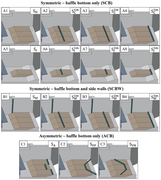 The figure shows different variants of (A1–A8) symmetric with baffles at the bottom (SCB); (B1–B4) symmetric with baffles at the bottom and side walls (SCBW); and (C1–C3) asymmetric baffle at the bottom (ACB) inlay (beige) and baffle (green) positions. In (B1–B4), side wall baffles are depicted on one side for illustration purposes; however, in the simulations, they were implemented on both sides.