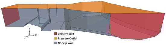 By default, the direction of this condition is the inner normal direction. Specifically, for the outflow, the direction is adjusted to point outward (i.e., in the outer normal direction). This approach is based on the principle that the volume of water entering the domain is equal to the volume leaving it, maintaining constant water levels at both the inlet and outlet. The inlet water level is maintained at a constant height of 1.85 m, while the outlet water level is determined by the inlet level and the differential height . The inflow and outflow velocities of the water are calculated based on the mass flow rate Q = 9.3 m3/s (see Table 1) of the simulation setup, divided by the cross-sectional area of the water inlet and outlet. For the air phase, the inflow and outflow velocities are set to 1 m/s to simulate the interaction with the atmospheric boundary conditions effectively. The air boundary (depicted in orange) was set to a pressure outlet condition of 0 Pa, related to the reference pressure of 101,325 Pa. For the wall boundaries (indicated in gray: bottom and side walls), a no-slip wall condition was employed. For the simulation, two distinct setups were employed. The first setup was utilized for simulating the initial 100 physical seconds, during which the system was in a transient state. To ensure numerical stability, a first-order time discretization with a time step of seconds and a sharpening factor of 0 was selected. For the next 100 physical seconds, a second-order time discretization with a seconds and a sharpening factor of 0.6 was used. Gravity was set to 9.81 m/s2 in the negative y direction. The water was assumed to have a constant density of 997.5 kg/m3 and a constant dynamic viscosity of 8.89 × 10−4 Pa s. For air, the ideal gas law was applied. Additionally, the air was modeled with a constant dynamic viscosity of 1.855 Pa s.