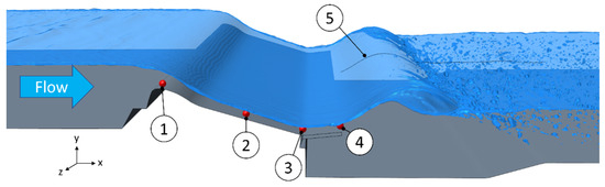 Visualization of probe locations for velocity measurements (1–4, red dots) and the wave height measurement (5, black line), which were selected to facilitate validation. The light blue arrow indicates the flow direction.