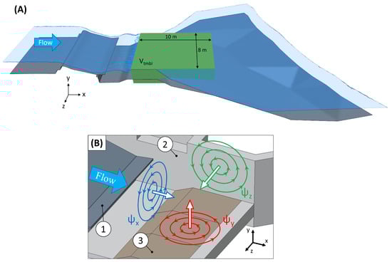(A) Vorticity calculation volume (green), measuring 10 m in length and 8 m in width, encompassing all cells below the water surface. (B) The image illustrates the rotational components of vorticity (blue), (red), and (green) in their respective planes within the three-dimensional space. The rotating arrows indicate the direction and sense of rotation of the components in the x, y, and z directions, corresponding to the orientation of the coordinate system shown in the upper left corner. Part (1) indicates the wave module, part (2) represents the concrete canal, and part (3) represents the inlay.