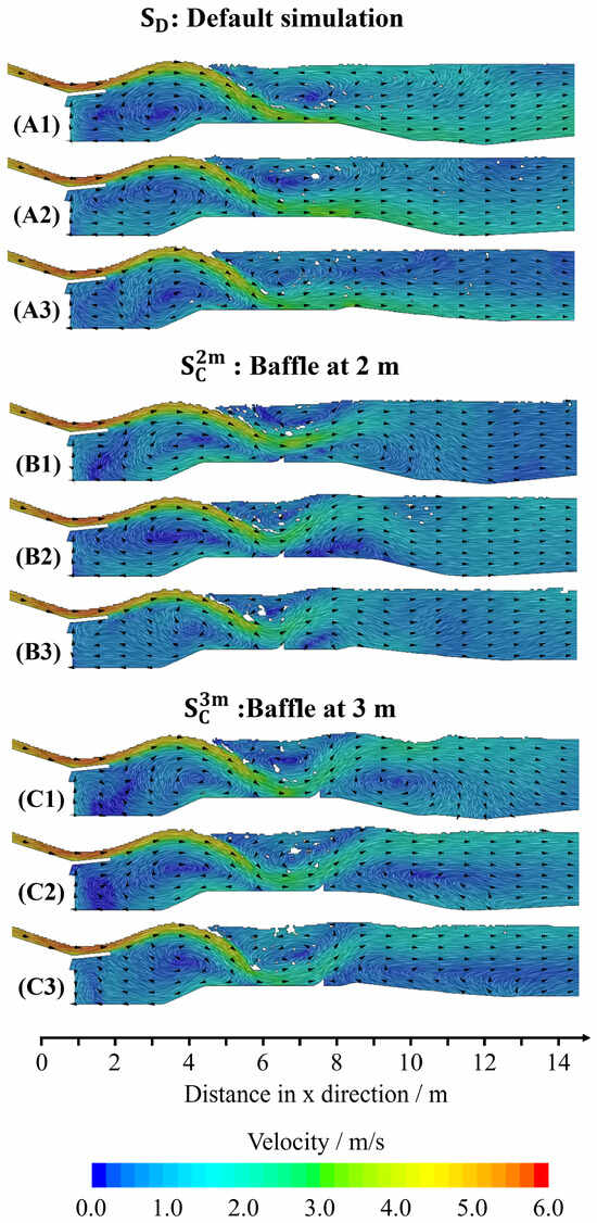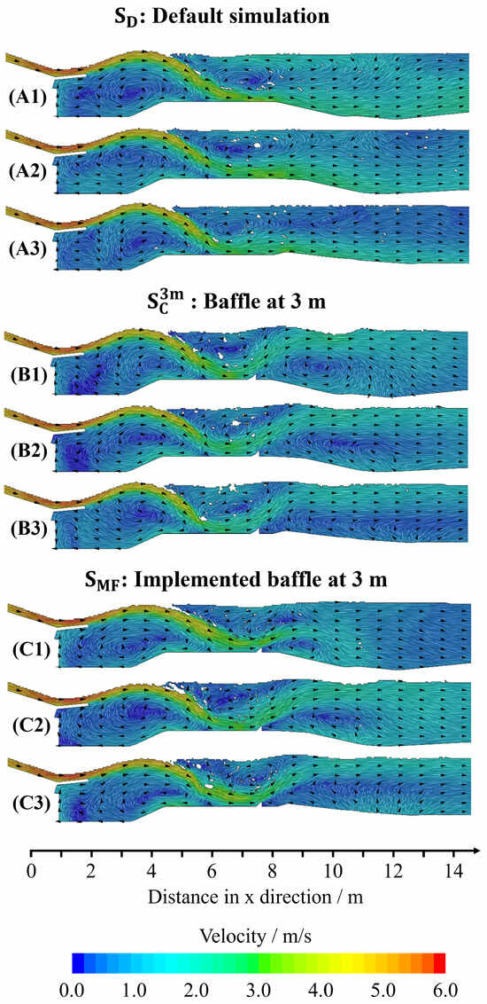 The figure shows the velocity flow field comparison for (A1–A3) for the default configuration (); (B1–B3) for the configuration with baffles positioned at 2 m (); and (C1–C3) the configuration with baffles at 3 m (). Sections (1, 2, 3) represent land, middle, and island, respectively, as shown in Figure 7.