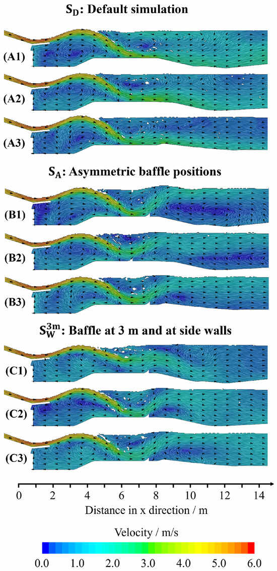 The figure shows the velocity flow field comparison for (A1–A3) for the default configuration (); (B1–B3) for the configuration with asymmetric baffle positions (); and (C1–C3) the configuration with baffles at 3 m and at the side walls (). Sections (1, 2, 3) represent land, middle, and island, respectively, as shown in Figure 7.