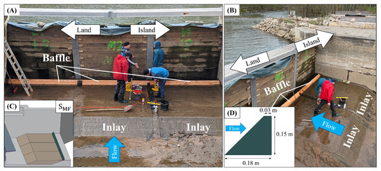 Based on the presented results, the Nürnberger Dauerwelle e.V. decided to implement a baffle into the actual Fuchslochwelle, which is shown in Figure 10A,B. The used geometry of the real baffle [Figure 10C] was slightly modified in comparison to the baffle geometry used for the simulation [Figure 10D] to facilitate easier manufacturing. The top edge of the baffle was cut off to reduce the risk of injuries for falling surfers. Due to installation constraints, the baffle’s position was fixed at a distance of = 3 m to ensure safe installation and prevent the baffle from being torn out due to water pressure.