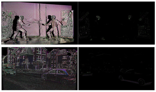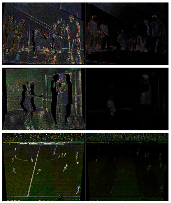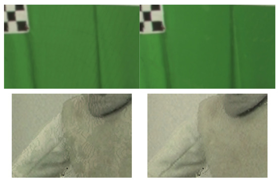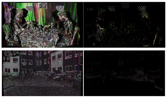 Comparison of the differences between the virtual view generated from the left view and the virtual view generated from the right view: Left column—original VSRS, right column—modified VSRS. From the top: Poznan Blocks, Poznan Street, Poznan Fencing 2, Poznan Carpark.