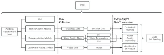 The functional modules of the UBP can be divided into the following seven parts: perception, planning, control, interaction, communication, payload, and navigation (Figure 3). Among them, the perception module is used to collect data from underwater sensors, such as water temperature, pH value, and TDS value. Underwater cultures are recognized through underwater cameras, combined with computer vision and machine learning. The navigation module provides real-time position estimation and trajectory planning based on GPS, BDS, and other technologies. The planning module is based on the Monte Carlo simulation to plan the cruise path and evaluate the water quality in the aquaculture area. The control module is based on the generation of low-level control commands to ensure navigation stability. The communication module is used for data exchange between the unmanned boat and the user and other devices. The interaction module carries out human–vessel interaction through the visualization platform on the software side. The payload module is used to carry mission-specific equipment (e.g., cameras, sensors, etc.).