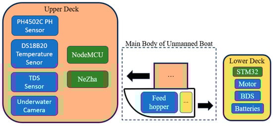 The hull structure is divided into two layers. The upper layer is the sensor layer. It mainly houses development boards and sensors required for the underwater vision module and the environmental data acquisition module. This includes the NodeMCU development board, the NeZha development board, the pH sensor, the temperature sensor, the TDS turbidity sensor, and the underwater camera. The lower part of the hull includes the bait chamber and the motion control module. The bait chamber is placed in the front for adding and dispensing bait. The motion control module is installed in the rear for powering and controlling the boat’s movement. To improve airtightness and waterproofness, all electronic devices on the lower level are installed in waterproof boxes. Additional protection is provided by sealing strips. Batteries and other key components are installed at the bottom of the boat. This lowers the center of gravity and improves stability in the water. The specific placement structure is shown in Figure 2.