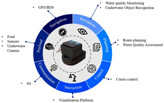 In the field of aquaculture, unmanned boats have been preliminarily applied in water quality monitoring, fishery feeding, and marine life observation. In terms of water quality monitoring [7,8], unmanned boats address issues such as inflexible monitoring locations and limited monitoring range. In terms of feeding [9,10], compared to traditional feeding methods, unmanned boat feeding technology resolves problems such as long feeding times, high labor requirements, and uneven feed distribution. In terms of marine life observation, artificial intelligence technologies, like deep learning, are applied to the identification of aquaculture subjects [11,12,13], providing crucial technical support for the refined management of fishery farming. However, there are also some common challenges in the widespread adoption of unmanned boats, such as high costs and difficulties in multifunctional integration.