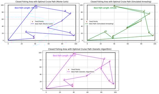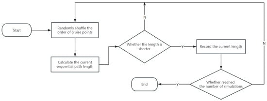 In fishery management, optimizing the visit order of feeding points is crucial to improve efficiency and reduce resource waste. Thus, the Monte Carlo simulation, which has been proved to be effective in route optimization [24,25], is applied for generating the automatic cruise route of the UBP. The basic idea of the Monte Carlo simulation is to generate a large number of random samples and conduct repetitive experiments. By statistically analyzing these samples, it estimates the solution to a given problem. Based on the feeding points in the aquiculture area, this paper designs a cruise path generation algorithm using the Monte Carlo simulation. This algorithm calculates the shortest cruise path in a shorter time to improve feeding efficiency. Figure 7 illustrates the flowchart of the algorithm.