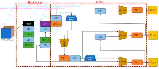 After image preprocessing, target detection is performed using YOLOv5. First, mosaic data augmentation, adaptive anchor box calculation, and image scaling enrich the dataset, enhancing robustness and inference speed. The backbone extracts features through the focus structure and convolutional operations, generating a 304 × 304 × 32 feature map, and optimizes computational cost and accuracy using the CSP module. The neck introduces the SPP module to enhance feature fusion and expand the range of contextual features. Finally, the prediction module divides the image into different grids, predicting target bounding boxes, positions, classification results, and confidence levels to complete aquatic target detection. The YOLOv5 network structure is shown in Figure 9.