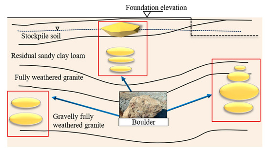 According to the geotechnical investigation report for the New Sports Center project [37], the design and construction in areas with boulders should consider their adverse effects. The design employs concrete composite pipe piles to treat the site and utilizes drilled root-planting pile construction. Drilled root-planting pile construction involves pre-drilled holes at specified locations, pouring in concrete, and then implanting precast pipe piles into the concrete to form a new type of composite pile foundation. Since boulders are commonly distributed within the depth range of the base piles, they should be incorporated into the load-bearing system rather than removed artificially. During the pre-drilled process, boulders are drilled alongside the formation of holes so that pipe piles can be inserted and concrete poured last. The schematic diagram of pre-drilled planted piles in boulder fields is shown in Figure 2, the red box is the name of the arrow pointing to the object.