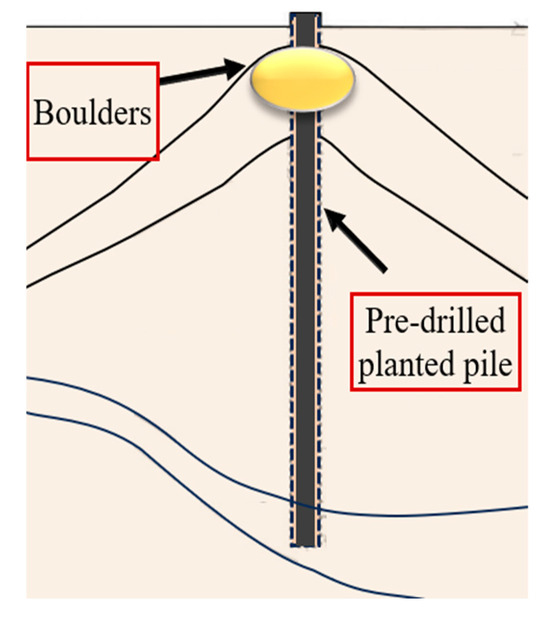 Schematic diagram of pre-drilled planted pile foundations in locations with boulders.