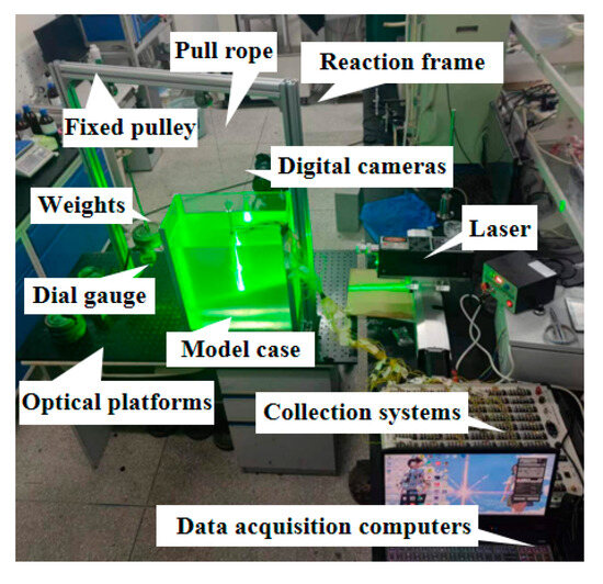 The model test apparatus, as shown in Figure 3, mainly comprises a model box, loading system, and imaging and information collection and processing systems, among others. Referring to Ni [34], the width of the model box was determined to be 200 mm to achieve maximum transparency of the transparent soil. Considering the size effect from related literature [38], the internal dimensions of the box were set as 400 mm in length, 200 mm in width, and 450 mm in height, constructed using 5 mm thick transparent acrylic sheets. The experimental loading system consists of a reaction frame, pull rope, fixed pulleys, loading platform, and weights. The load application was achieved by increasing the number of weights. Two fixed pulleys were secured at designated locations on the reaction frame: one for positioning the model box (the center point of the model box, with distances of 200 mm and 100 mm from the edges) and the other for determining the load application position. A rope was passed through the pulleys, connecting the toggles at the top of the piles to the weight trays (where the experimental weights were placed). The imaging system includes a laser, a digital camera, a DH3816 static strain testing system, and a notebook.