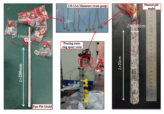Two conditions are established: one without boulders in the pile body (Condition 1) and another with boulders located in the pile body (Condition 2), to comparatively analyze the impact of boulders on the bearing capacity of planted piles. In the model tests, the core pile of the foundation pile model was made of a hollow aluminum tube, while the outer concrete of the pile was composed of epoxy resin. To prevent laser reflections from the aluminum tube that could affect observation and image capture, the surface of the aluminum tube was coated with black paint. The construction of the pile planting model is illustrated in Figure 4, the red boxes are strain gauges. After the surface coating dries, a layer of quartz sand is wrapped around the outer surface of the pile to simulate realistic pile formation effects. Based on the engineering planted pile prototype, the model pile size was determined according to the geometric similarity ratio of 1:100, and the model pile parameters are shown in Table 2.