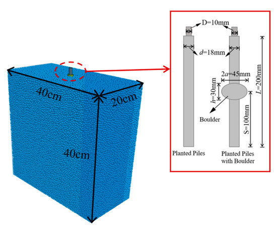 The soil is simulated by particles with a diameter ranging from 3 to 5 mm, totaling 160,000 particles. The friction coefficient between particles is set to 0.4, while the friction coefficient between particles and wall elements is set to 0.1. The numerical calculation model is illustrated in Figure 5, the red box shows the dimensional details of the pile.