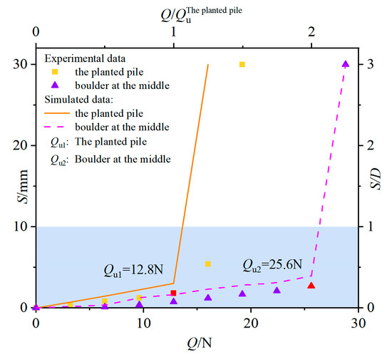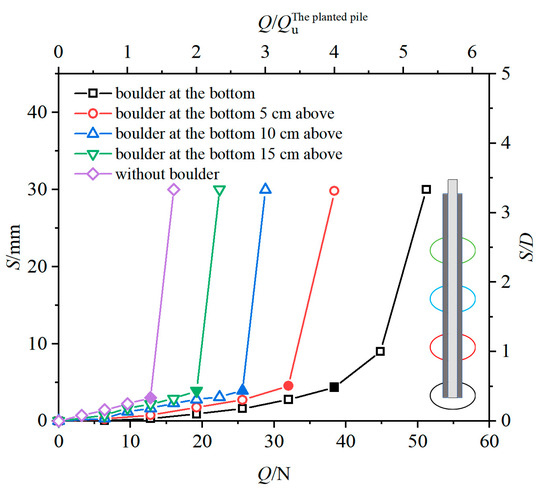 The load–displacement curves of planted piles under different boulder burial depths.