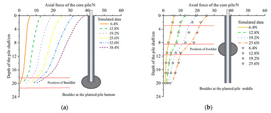 Axial force diagram of core pile: (a) Variation of axial force in core pile under Condition 1; (b) Variation of axial force in core pile under Condition 2.