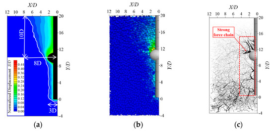 Displacement contour map and particle force chain diagram of soil around planted pile under Condition 1: (a) experimental displacement contour map of soil; (b) displacement map of numerical simulation; (c) particle force chain diagram of numerical simulation.