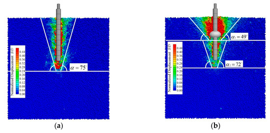 Figure 10a shows the sliding failure surface for Condition 1, where the angle between the sliding surface and the horizontal plane is 75°, indicating that the influence of the pile on the soil is primarily concentrated in a narrow region along the pile shaft. Figure 9b presents the sliding failure surface for Condition 2, where the boulder is in the pile; thus, the sliding surface can be divided into two parts, above and below the boulder. Below the boulder, the movement of the soil is influenced by the boulder, resulting in a decrease in the sliding surface angle from 75° to 72°. Simultaneously, the angle of the sliding surface of the soil above the boulder diminishes from 75° to 49°. The presence of the boulder significantly affects the morphology of the sliding failure surface during the uplift of the pile, leading to changes in the angle of the sliding surface.