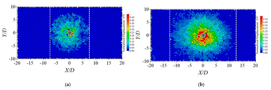 Figure 11 illustrates the surface deformation characteristics under different conditions. When the uplift displacement of the pile is 3D, the sliding failure surface has extended to the ground surface. In this case, the influence range of surface uplift for Condition 1 extends up to 7.5D, as shown in Figure 10a, while for Condition 2, it expands to 13D. The presence of the boulder provides the pile with more pathways for load transfer and resistance, significantly increasing both the uplift load and displacement, thus enhancing the pile’s influence on the soil, as illustrated in Figure 11b. Thus, for the same upward displacement, the range of surface uplift is influenced by the presence of a boulder. The influence range of piles containing a boulder on the ground surface is larger. This may be attributed to the boulder enabling the pile to withstand greater uplift forces, thereby subjecting the surrounding soil to higher stress and affecting a wider area. It is also worth noting that the presence of the boulder increases the bearing capacity of the pile and correspondingly expands its influence on the surrounding soil. Therefore, when the cross-sectional area of the boulder is approximately four times that of the pile and it is located in the middle of the pile, attention should be paid to the impact of the pile on other piles in engineering practice, with a recommended spacing greater than 8D.