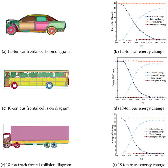 To ensure the reliability and effectiveness of the vehicle model used in the collision simulation analysis, the selected vehicle finite element model was verified using a frontal collision test before the collision analysis. A rigid wall was set 20 cm from the front of the vehicle bumper, and the vehicle impacted the rigid wall vertically at a speed of 50 km/h. The rigid wall simulates the ground and the rigid wall being collided [38]. Figure 3 shows the finite element frontal collision experiment diagram and energy change curve of the three models. The deformation of the vehicle components during the collision process was reasonable, and no element distortion or penetration occurred. The collision effect in the simulation experiment was reasonable. After analysis of the three models, the hourglass energy of the collision model was 4%, 2%, and 4% of the initial total energy of the system, respectively, which was less than 5% of the total energy. Therefore, the frontal collision test simulation results were reliable, and the vehicle model could be used for further simulation analyses.