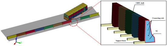 The Holmquist–Johnson–Cook (HJC) model was used to simulate UHPC and NC, and the calibration of the relevant parameters is presented in Section 3.2. The connecting rods and dowel bars were simulated using the MAT-PLASTIC-KINEMATIC. The keyword *Constrained-Lagrange-In-Solid was used to connect them with the internal concrete. The size of the support block placed at the interface between the two UHPC shells was 400 mm × 400 mm × 100 mm, and a rigid material model was used in this simulation to simplify the simulation and constrain its six degrees of freedom. In this finite element simulation, pavement deformation was ignored, and the pavement was treated as rigid; therefore, the ground adopted a rigid material model and its six degrees of freedom were also constrained.