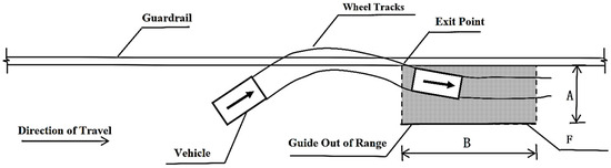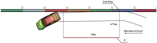 According to the calculation in Equation (12), for a 1.5-t car, A = 4.71 m, B = 10 m. The trajectory of the car is illustrated in Figure 8. Following the collision with the barrier, the car did not deviate from the guiding exit frame, nor did it pose a threat to adjacent vehicles in the same direction. This indicates that the barrier effectively served its guiding function.