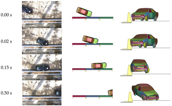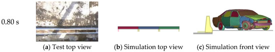Over the entire process, the vehicle moved away quickly, and there was no phenomenon of overriding or riding over the barrier. The simulation results of the vehicle trajectory agree well with the experimental results. However, the vehicle traveled differently after the collision with the barrier. In the full-scale vehicle crash test, the car gradually moved away from the barrier after the collision and continued to travel along the exit angle. In the numerical simulation (Figure 8), the car traveled longitudinally along the barrier after the collision. The main reason for this difference is that in the numerical simulation, the right front wheel was held dead after the collision with the barrier and could not continue to rotate, resulting in the vehicle not being able to control the steering and could only move forward under the effect of inertia. This phenomenon may occur in actual collisions, that is, vehicle collisions may cause tire blowouts or vehicle steering lockups.