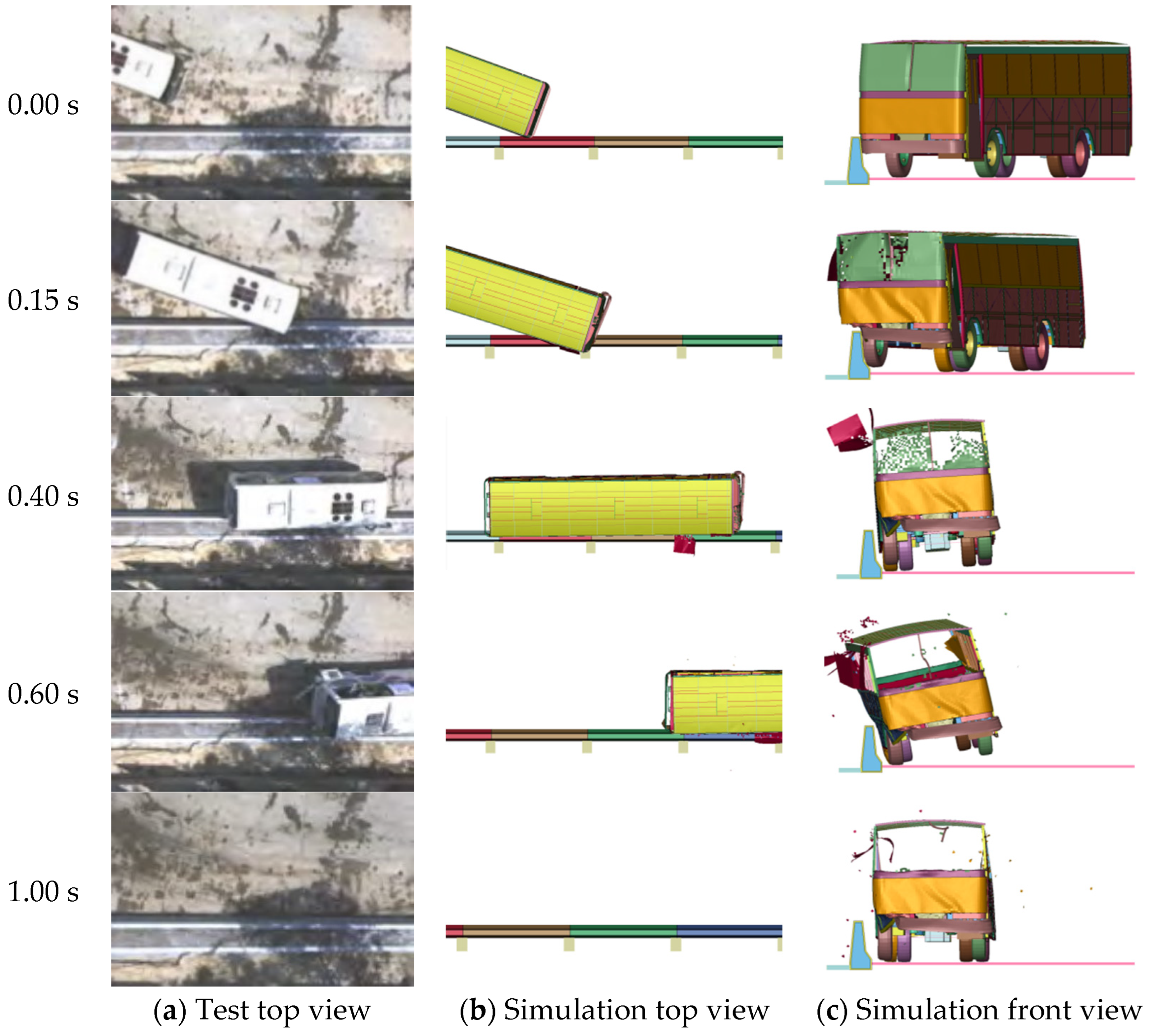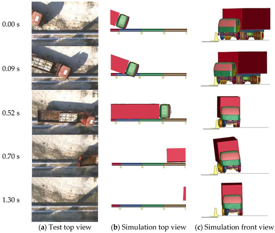 The vehicle trajectory obtained from the test and numerical simulation of the truck is shown in Figure 11; when the truck collided with the barrier, its front bumper was squeezed and deformed. Then, the right front wheel began to climb to a small extent. During this process, the truck turned gradually. The front-right chassis of the cargo compartment contacted the barrier and was scraped from the top of the barrier. The scrape length was approximately 4 m. After 0.4 s, the track’s front wheel was out of the barrier to complete steering, and the body was almost at the level of the barrier. Owing to the high center of gravity of the carriage, under the action of inertia, the right rear wheel hit the barrier at 0.52 s, and the barrier experienced a secondary collision. The carriage was slightly overturned. The truck then slowly fell back to the ground owing to gravity, and the front wheel was not pulled in the right direction. After 1.3 s, the vehicle’s rear broke away from the barrier and ran almost parallel to it.