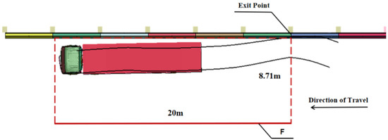 According to the formulas, in the calculation in Equation (13), A = 8.71 m and B = 20 m for an 18-ton truck. The trajectory of the 18-ton truck is illustrated in Figure 12. After the truck collides with the barrier, it remains within the guiding exit frame but veers out at an angle nearly parallel to the barrier. This indicates an effective guiding function by the barrier.