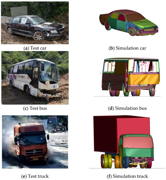Figure 13 compares the vehicle damage caused after the real vehicle test and numerical simulation collision. As shown in Figure 13a,b, the car’s front bumper was damaged in both cases. The right headlight was damaged and detached, and the right front side of the vehicle’s body was scratched and damaged. After the collision test, the front bumper of the bus was squeezed and deformed, the collision side of the vehicle body was scratched and damaged, and the tail of the collision side was squeezed and deformed, owing to the secondary collision (Figure 13c,d). In Figure 13e,f, the truck’s front bumper was deformed by crushing against the barrier, and scratches and damage were observed on the crash side of the body. In conclusion, the numerical simulation results are in good agreement with the test results.