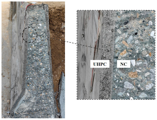 After the collision, the contact between the barrier shell and the internal filler concrete was examined, as shown in Figure 14. The bond between the UHPC shell and the internal concrete was good, indicating that the UHPC shell and the internal concrete was a synergistic force during the collision.
