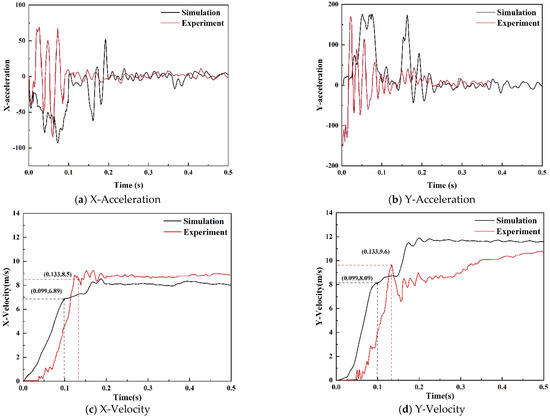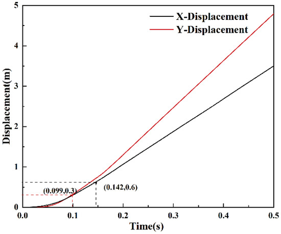 According to Equations (16) and (17), the theoretical displacement curves of the occupant’s head in the X and Y directions during the vehicle collision in the numerical simulation can be obtained (as shown in Figure 16), with tx = 0.142 s and ty = 0.099 s. Therefore, the occupant collision time t0 is taken as 0.099 s. Using Equations (14) and (15), the acceleration curves are integrated, yielding the occupant collision speeds in the X and Y directions in the numerical simulation, which were subsequently compared with the results of the real vehicle collision test (Figure 15c,d).