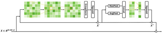 Compared with the fully connected layer, the one-dimensional convolution can take advantage of the parameter sharing and local connection of the convolution layer, further reducing the computational overhead, that is . In addition to adjusting the convolution kernel size as needed, the one-dimensional convolution can also implement other extended convolution operations in the operator, such as introducing the dilated convolution technology [46], which maintains the amount of computation and the number of parameters while increasing the receptive field. Since batch normalization is heavily dependent on the mini-batch size and may have a negative impact on smaller network architectures, we use group normalization to be more stable when training small batch samples or with different batch sizes [47]. Group normalization and the Sigmoid activation function are then used to process the enhanced position information to obtain the representation of position attention in the horizontal and vertical directions. The above process can be expressed as