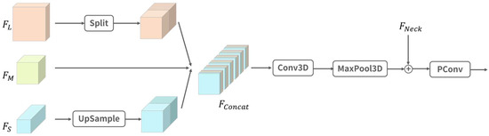 Next, as shown in Figure 2, we concatenated all feature maps with the same scale to obtain the feature map and stacked them in the new dimension. Then, we extracted the combination of features at different levels and scales through 3D convolution (Conv3D) to obtain a richer multi-level feature representation [52]. However, features of different scales may contain different degrees of noise, especially in low-resolution features, where noise may be more obvious. When these features are fused, the noise may be amplified, affecting the performance of the model. When dealing with complex backgrounds or low-quality images, the impact of noise may cause the model to learn incorrect features. In addition, multi-scale features may contain similar information, and this redundant information may mask important features and affect the performance of the model. Therefore, we used 3D maximum pooling (MaxPool3D) to reduce redundant information, suppress the impact of noise, and emphasize important features to enhance the robustness of the model when processing noisy data. Finally, the output features were added to the neck network (), and point convolution (PConv) was used to fuse information between different channels to enhance the expressiveness of the model.
