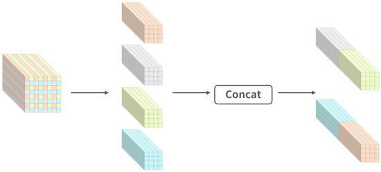 The Split operation divides the large feature map into blocks with a scale of 2, concatenates the feature values at the same relative position in each block together with their channel dimensions, and finally forms a new sub-feature map. Relative to the original input feature map , the shape of each sub-map is , which can be regarded as the result of pooling calculations using specific position values to retain the original image, which retains all information in the channel dimension and avoids information loss.