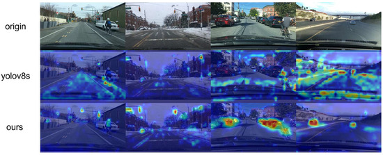 In this section, we aimed to visually demonstrate the impact of environmental perception attention (EPA) on the model’s attention mechanism. To achieve this, we utilized GradCAM [58] to generate a visual heat map for the output feature map of the backbone network to show the model’s attention area before and after the application of EPA, as shown in Figure 5. In the heat map, warm and cold tones are used to distinguish the contribution of position pixels to the prediction results. The warmer the color, the greater the contribution of the position to the final prediction result of the model, indicating more important position information and greater attention paid by the model. The colder the color, the opposite is true. As seen in Figure 5, the attention distribution of the baseline model was relatively scattered, and it also produced large responses to many unimportant areas. Compared with the baseline model that does not use EPA, EPA could effectively organize the model’s attention area, avoid distracting attention to useless locations, and significantly reduce the feature response to irrelevant areas. This shows that the EPA module we proposed could effectively guide the entire network model to focus more accurately on the area where the target to be detected is located.