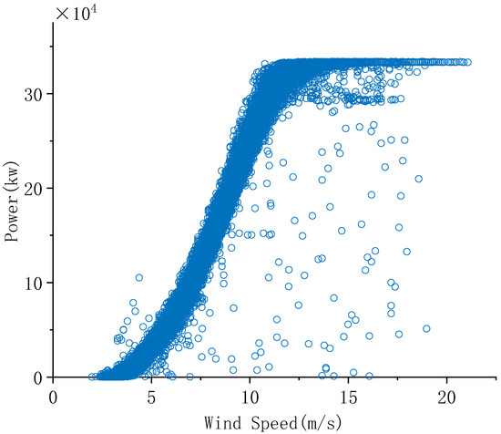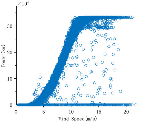 The SCADA data of wind turbines contains a large amount of valuable information. Deleting all the data would result in the loss of useful content, negatively impacting the model’s training and prediction. Therefore, removing only the abnormal or unexpected data helps preserve the normal operational data. Excessive data removal could lead to a sparse training set, affecting the model’s learning ability. Since there is a nonlinear relationship between wind speed and power, not all of the wind speed-power values are considered anomalies. By applying specific filtering criteria, unreasonable data can be removed while retaining most of the valid data and eliminating obvious outliers, as shown in Figure 3.