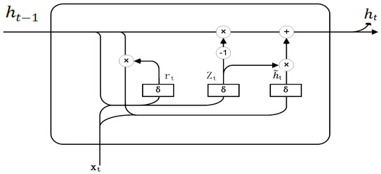 A GRU (gated cycle unit) is a recursive neural network (RNN) variant proposed by Cho et al. [30] in 2014 to process sequence data. The GRU [31,32] is designed to solve the gradient disappearance problem often encountered by traditional RNNs with long sequence data and to improve the model memory of time steps by introducing a gating mechanism. Compared to an LSTM (long and short-term memory network), a GRU simplifies the structure while maintaining similar performance and, therefore, is more computationally efficient and comparable to LSTM in many tasks. The core idea of GRU is to use gating mechanisms to regulate the flow of information between time steps to dynamically determine which information needs to be retained and which needs to be discarded. This mechanism enables the GRU to efficiently address long-term dependency issues. Compared to the traditional RNN, the GRU has two main gatings: the update door and the reset gate. The update gate combines the forgetting gate and the input gate of the LSTM to regulate the retention of information, while the reset gate controls the discarding of information. With this structure, a GRU can effectively capture dependencies in temporal data while reducing training time and maintaining high prediction accuracy. The GRU memory unit structure is shown in Figure 4.