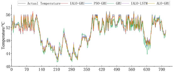 In order to evaluate the accuracy of the model in predicting the lubricating oil temperature of the gearbox, four models, PSO-GRU, IALO-LSTM, ALO-GRU, and GRU, were constructed for comparative analysis. All models used the same data samples and optimized parameter settings to predict the oil temperature of the gearbox during normal operation. The experimental results are shown in Figure 7. To evaluate the accuracy and parameter fit of the five models, root mean square error (RMSE), mean absolute percentage error (MAPE), and goodness of fit statistics (r2) were used as the evaluation indexes. The specific expressions are as follows: